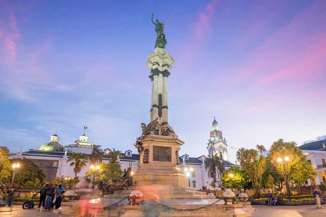 Quito, la capital de Ecuador, se ubica en la altura de las laderas de los Andes a 2,850 m. Fue construida sobre los cimientos de una antigua ciudad inca y es famosa por su centro colonial bien conservado, con varias iglesias de los siglos XVI y XVII, y otras estructuras que mezclan estilos europeos, moriscos e indígenas. Estos incluyen la catedral, en la Plaza Grande, y la iglesia jesuita altamente decorada de la Compañía de Jesús.